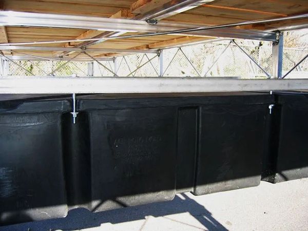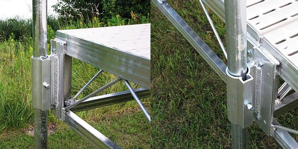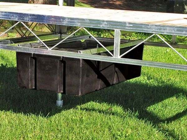The truss style frame allows the dock to rest on foam filled, plastic rotocast floats. Connecting the floats to the frame are aluminum clamping brackets, allowing the floats to be added to a frame wherever needed!