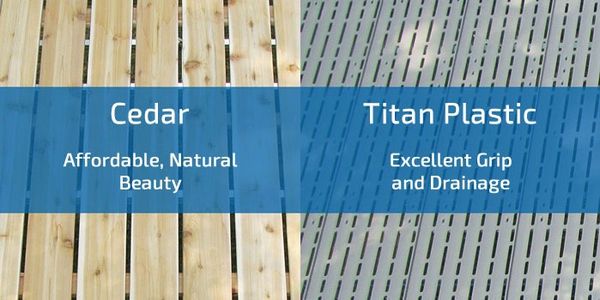 Roll-in docks are easy to assemble and come with two different styles of decking: cedar and Titan plastic. Each type offering its own charm and benefit. The natural beauty of cedar is unmatched. The ribbed texture on our aluminum decking offers superior traction. Titan plastic is strong, durable and virtually maintenance-free. This polypropylene decking is designed for grip and drainage and can handle anything Mother Nature throws its way. All of our decking is made in 4′ x 4′ removable sections for easy installation.
