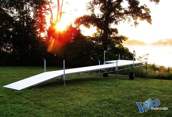 All of our roll-in docks are made of structural tubing from 6061 and 6063 aluminum alloys. Vibo docks are strong yet lightweight, ensuring a durable dock for a lifetime of service. Roll-in docks are well suited for gradually sloping, fairly smooth lake shores. Installation couldn’t be simpler, easily roll the entire bolted together dock system into the water. Wheel kits come standard with every roll-in dock configuration. With 11 different deck sections to choose from the layout options are endless. Let our experts help you design the dock system to fit your lifestyle. View Roll-In Dock Layouts